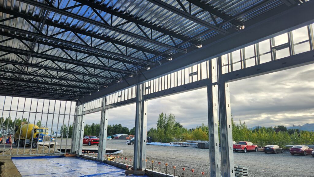 Did the extreme winter weather in Anchorage, Alaska shut down progress at the Kendall Ford construction site? Not a chance! The winter work of deep over-excavation, structural fill and foundation pouring allowed the steel to be erected this summer and keep the project on schedule. It should be closed-in soon, ready to take the brunt of cold, wind, snow and earthquakes.